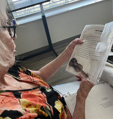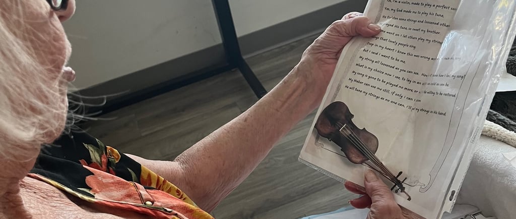 Next, she opened her cabinet and brought out a notebook that was filled with original poetry. The first rhyme she read was about Jesus. A poem about a violin came next. It talked about the dangers of wasting time and allowing other people to play your strings. We had a rich exchange about our lives. She was not going to allow Parkinson's disease to steal her joy or block the flow of her creativity and fruitfulness. To crown all that, her name was Virginia, just like my Mama's home state. After prayer, I walked into the last room on the list. Her name was Margaret, the same name as my mom. With thirst quenched, I knew that I was in the flow of my day. I couldn't wait to share my encounter!