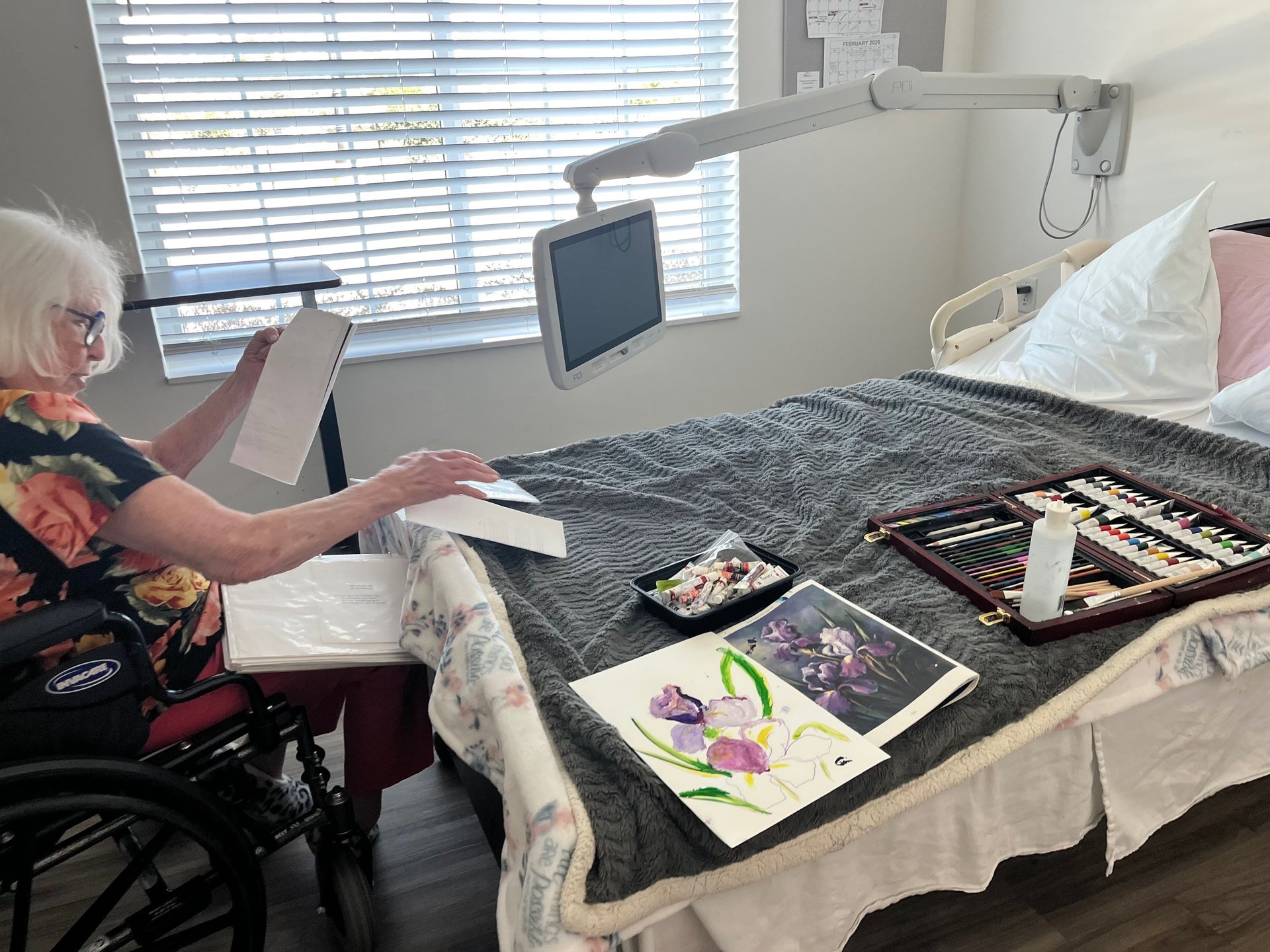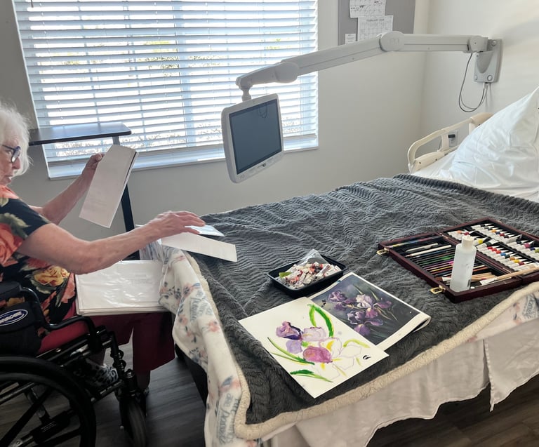 When I walked through the doors, each resident perked up with bright smiles and thank you’s. But one lady, who was not on the distribution list, rolled out of her room and handed me invitation. Once inside her room, I felt like I had entered an art studio. First, her bed was covered with paint, paint brushes and painted flowers. But the creativity didn't stop there.